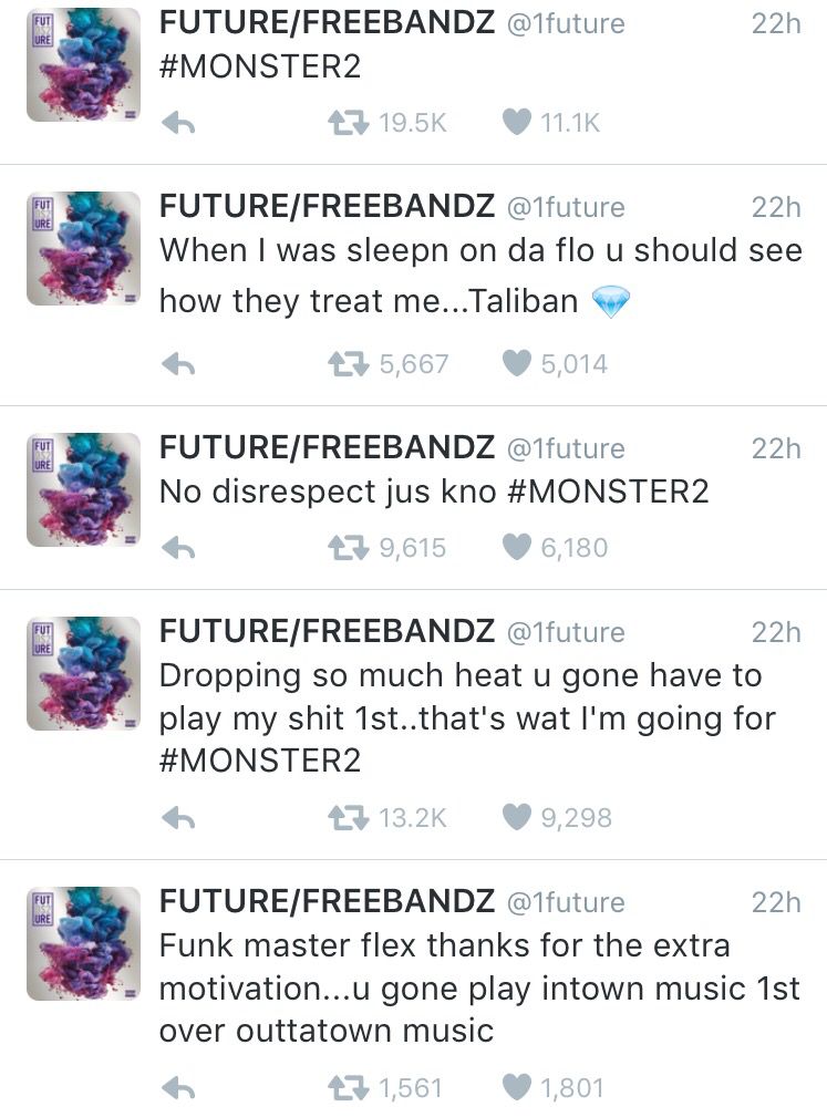 Future, who’s from Atlanta but gets radio love all over the country, responded to Flex’s words with a series of conveniently promotional Tweets: