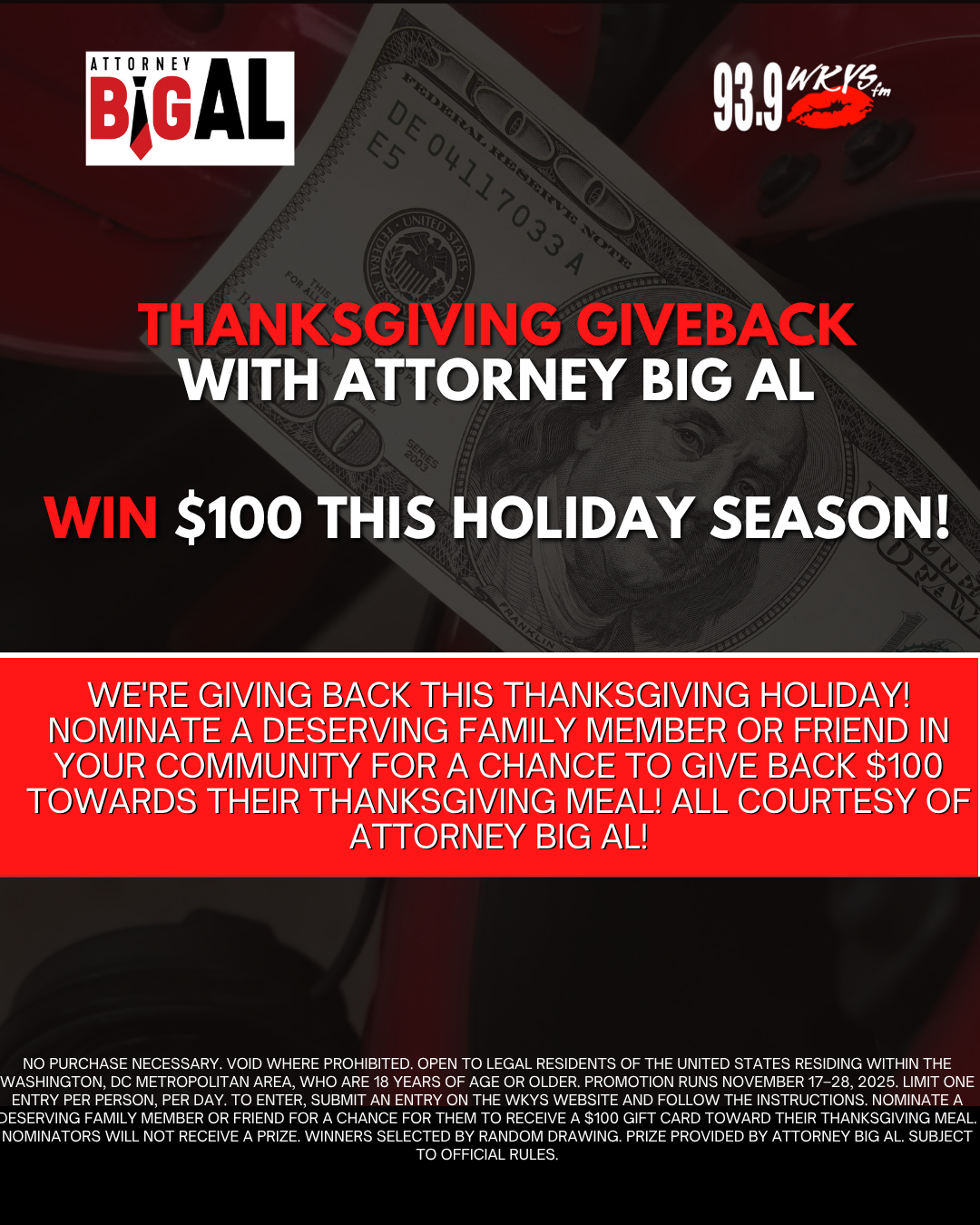 We’re giving back this Thanksgiving! Nominate a deserving family member or friend for the chance to receive a $100 gift card toward their holiday meal — all courtesy of Attorney Big Al.