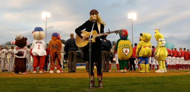 4/5/2007 Photo by Krissy Krummenacker 200700708 Country singer Taylor Swift, originally from Wyomissing, sings the national anthem Thursday, April 5, 2007, before the Reading Phillies opening game against the Harrisburg Senators at FirstEnergy Stadium. (Photo By Krissy Krummenacker/MediaNews Group/Reading Eagle via Getty Images)