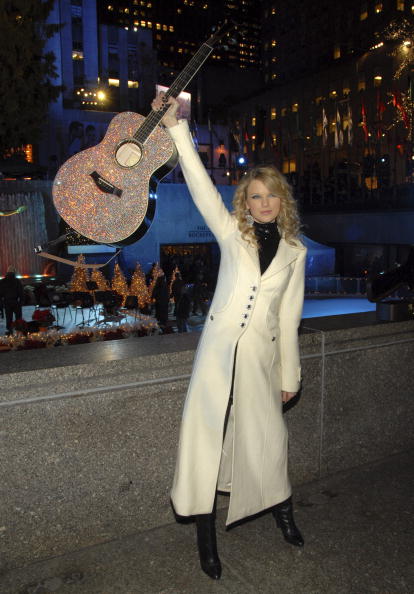 Country musician Taylor Swift holds up a guitar while posing for photographers at the 75th Rockefeller Center Christmas Tree Lighting Ceremony in New York 28 November 2007. The 84-foot-tall tree was lit with 30,000 energy efficient LED lights. AFP PHOTO/Nicholas ROBERTS (Photo by NICHOLAS ROBERTS / AFP) (Photo by NICHOLAS ROBERTS/AFP via Getty Images)